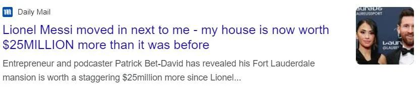 近日,美国企业家帕特里克·贝特·大卫(Patrick·Bet·David)在接受采访时表示,自从阿根廷足球明星梅西一家搬到他家隔壁居住之后,他家的房子增值了2500万美元。