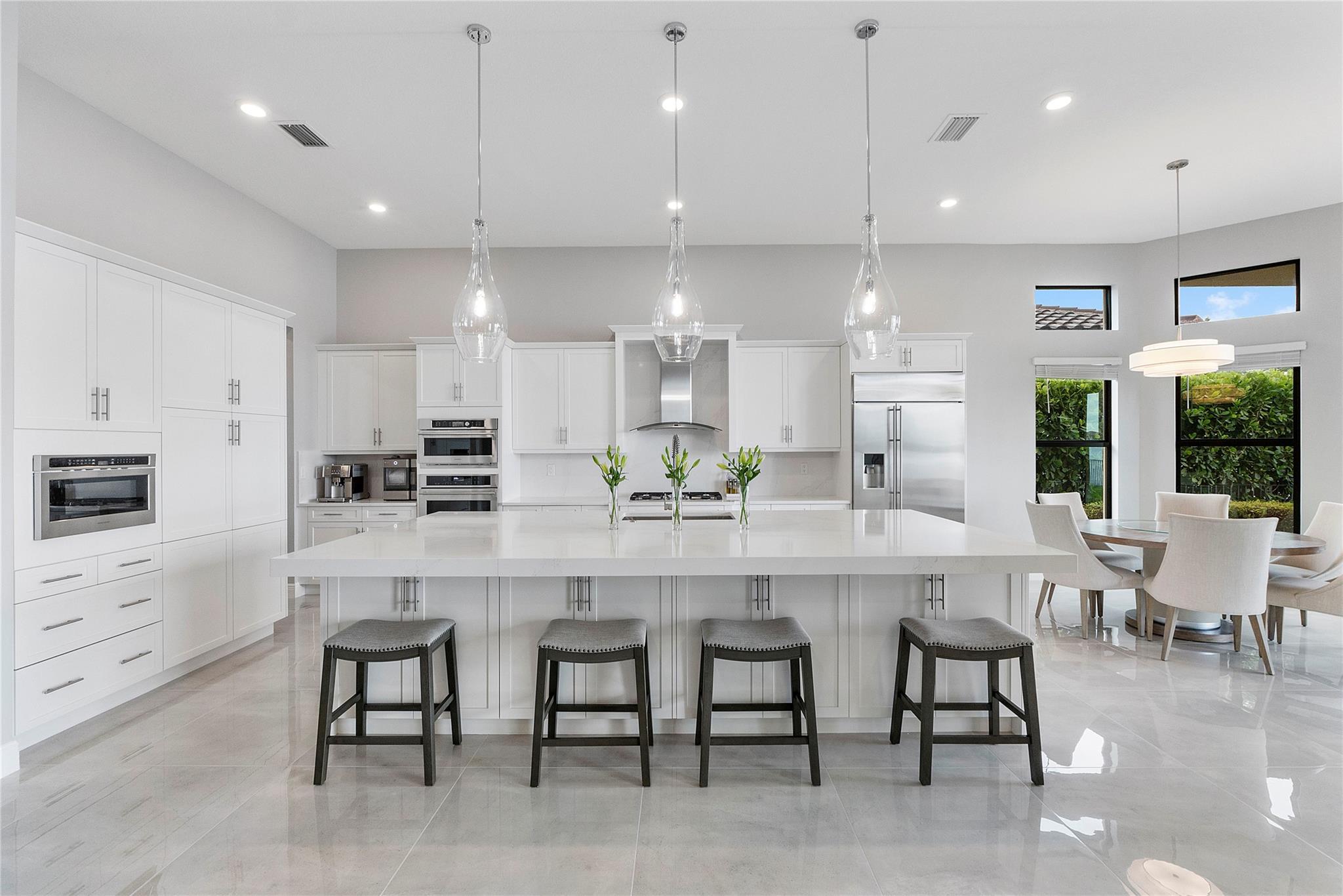 室内配置亮点包括:双石英台面厨师级厨房、GE Monogram 专业家电、一层高光瓷砖、装饰墙板设计、二层木地板、升级楼梯扶手、平整墙面处理与全屋定制收纳。