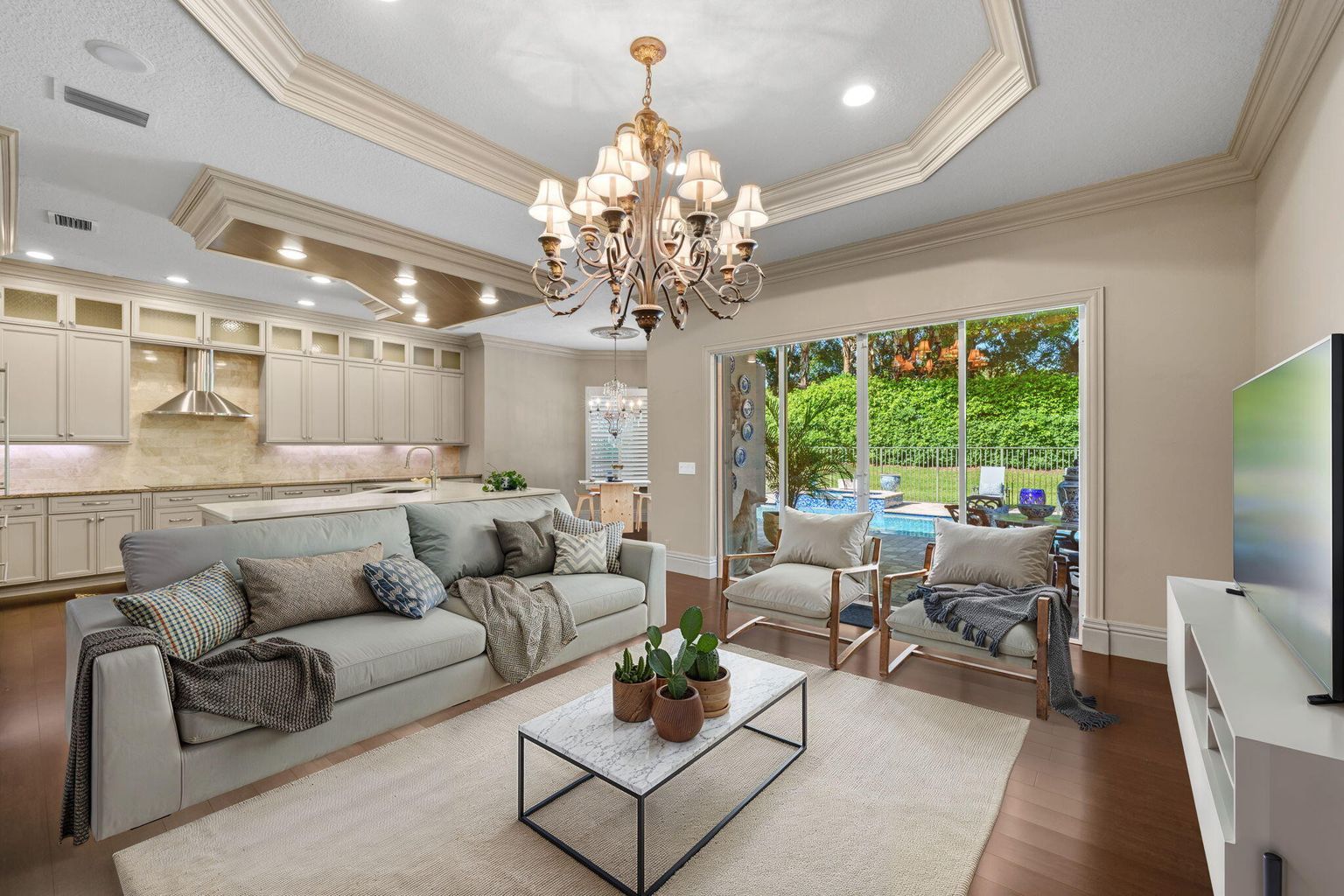 从踏入的那一刻起,高达 20 英尺的挑高天花板与落地窗将自然光注入整个开放式平面布局,营造出温暖而迷人的氛围。