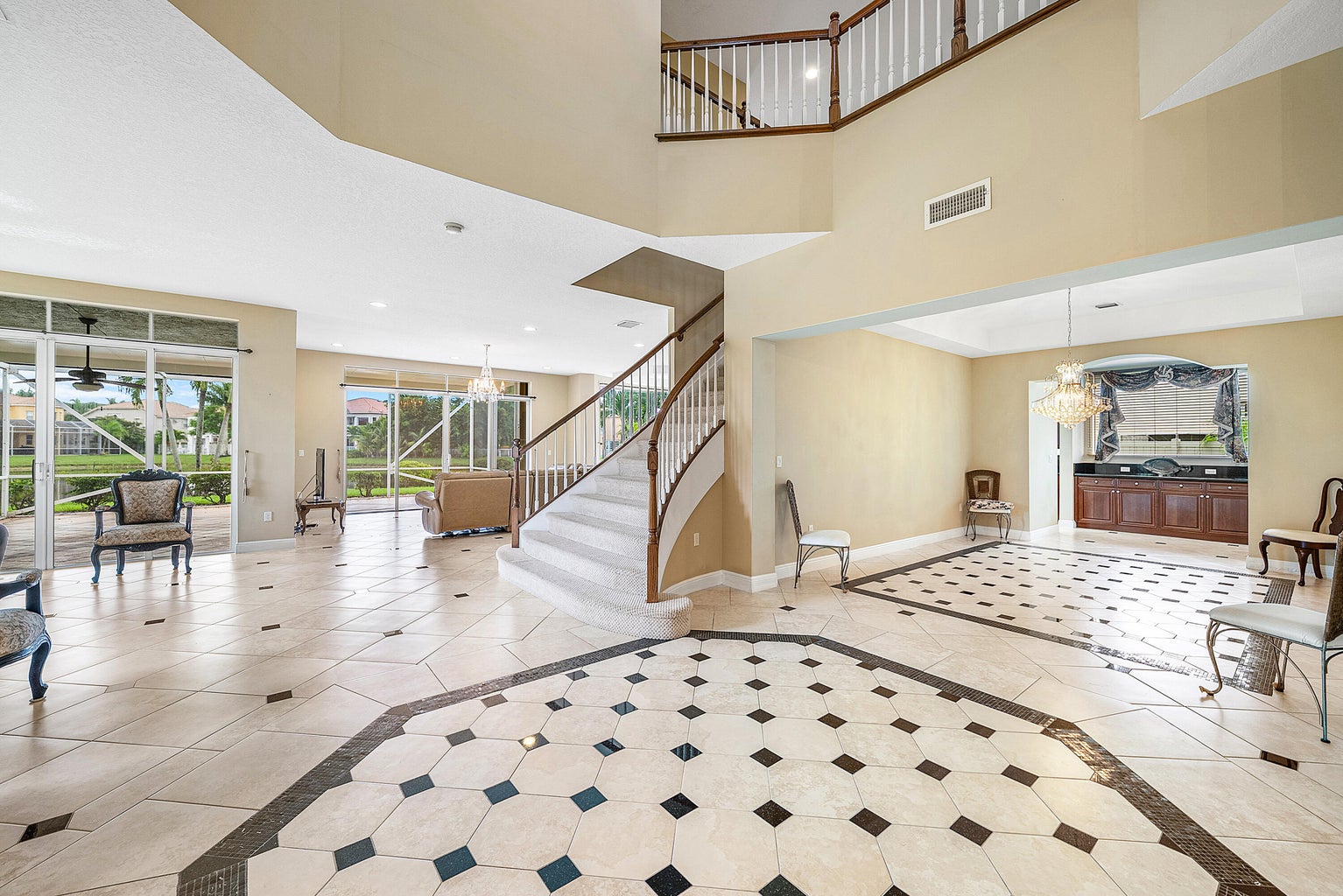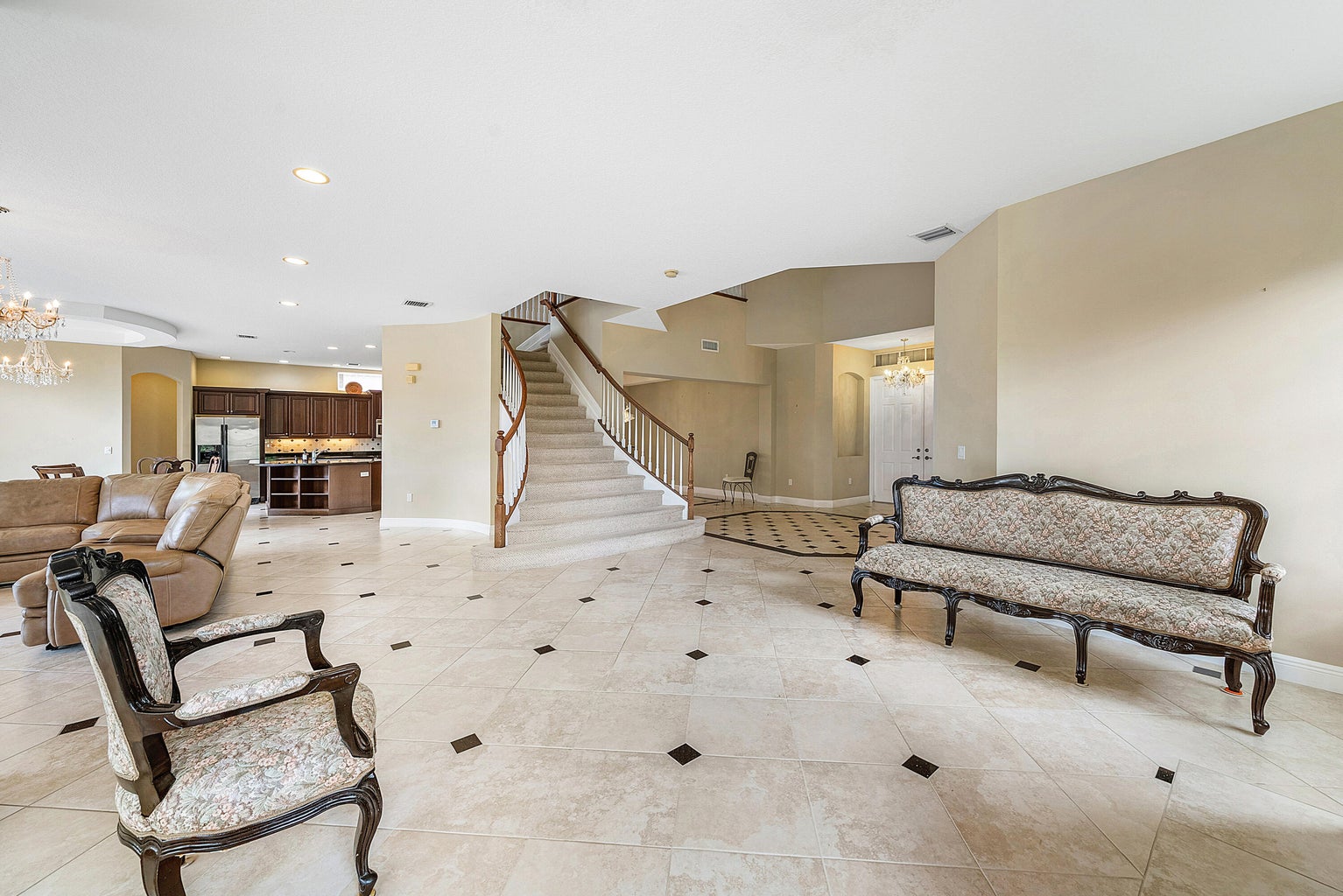 走入双开大门,映入眼帘的是优雅的双色斜铺瓷砖,空间划分井然有序——正式客厅与餐厅配有华丽的吊灯,让这栋 4000 多平方英尺 的住宅宛如一座小型宫殿。